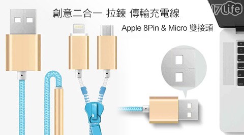 創意二合一拉鍊傳輸充電線Apple 8Pin&Micro雙接頭"